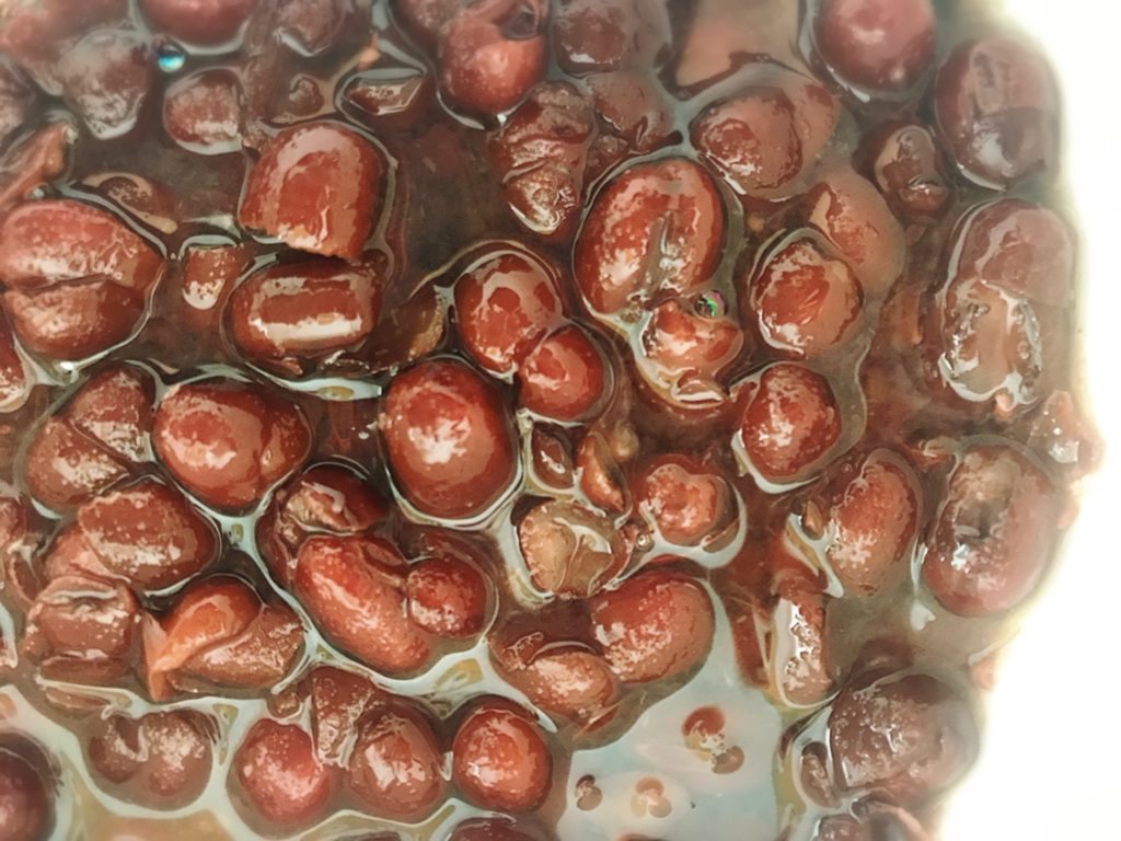 途中煮汁が減ったら水を加え、常に水が豆にかぶる様にしてください。
