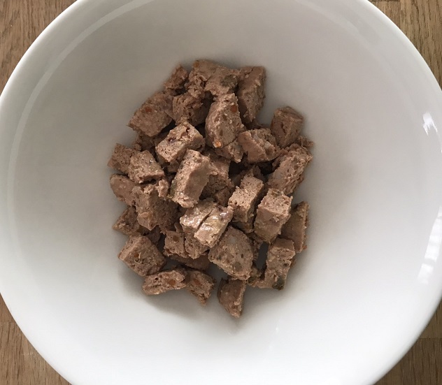 【3】プラチナム ウエットフード (チキン)をほぐしてお皿に盛ります。