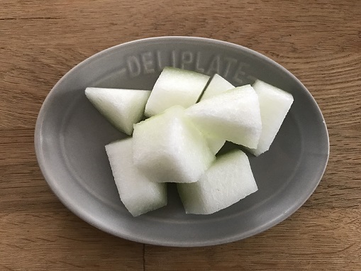 【2】小冬瓜のワタをとり皮をむき食べやすいサイズに切ります。