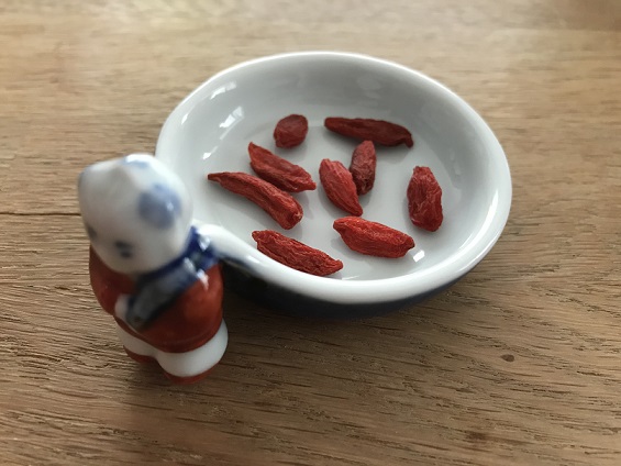 最初は強火で。グツグツし始めたらクコの実を加えて弱火にする。