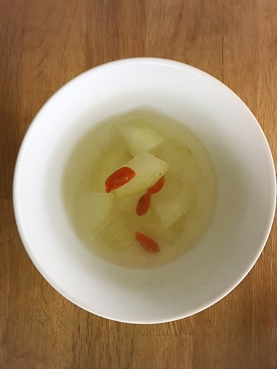 【6】【5】の上に冬瓜、クコの実を盛り付け、最後に鶏の出し汁を適量かけたら完成!