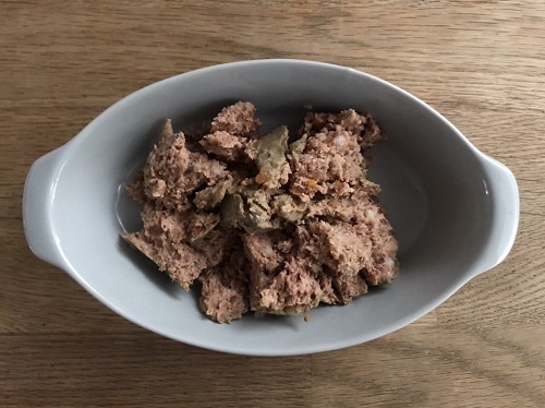 【5】プラチナム ウエットフード (ターキー+サーモン)をほぐして皿に盛る。
