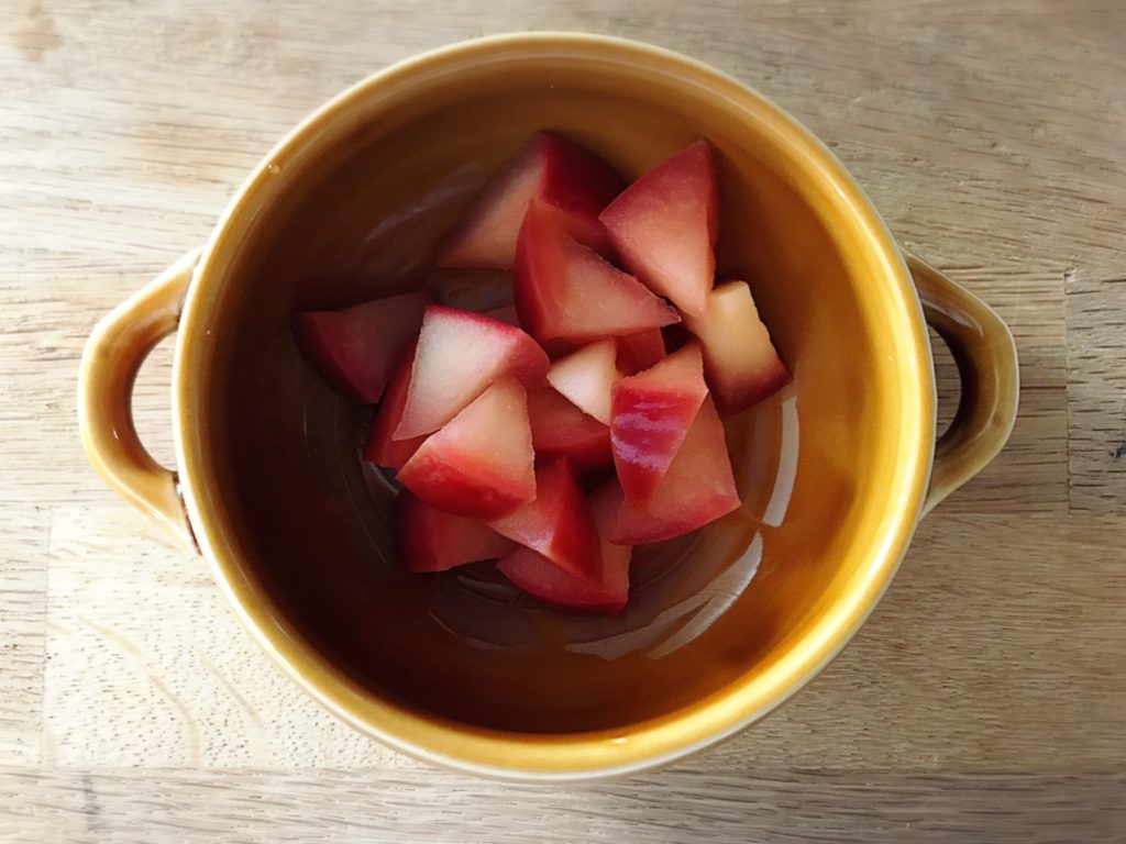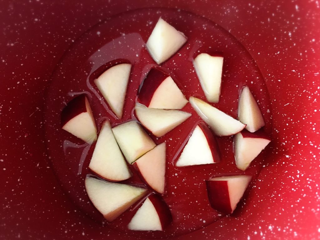 【2】りんごを小さく刻み、ひたひたになる程度の水で煮る。柔らかくなったら冷ます