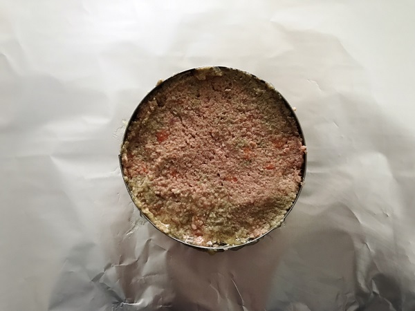 【1】プラチナム ナチュラル ドッグフード(ターキー+サーモン)をほぐして型につめた後、型崩れしにくくなるよう冷蔵庫で冷やす