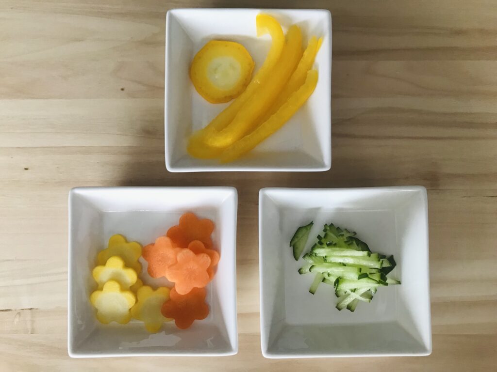 【2】野菜をカットしていく。ズッキーニはまず3~4枚スライス。1枚はそのままで、残りは花の形に型抜き。にんじんも2~3枚花の形に型抜く。パプリカは細切り、きゅうりは千切りに。全ての野菜を切り終えたら水にさらしておく
