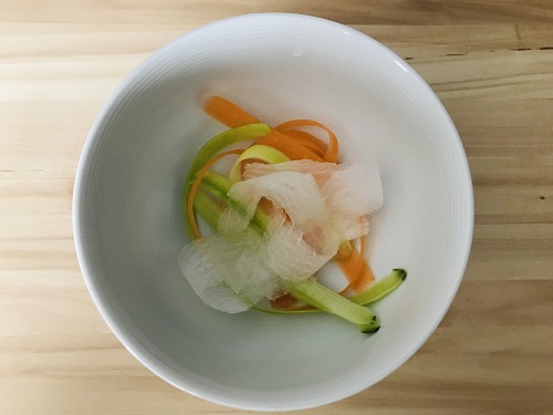 【1】にんじん、大根、きゅうりをピューラーで薄くスライスし、電子レンジ等でやわらかくする。粗熱が取れたらごま油を和える