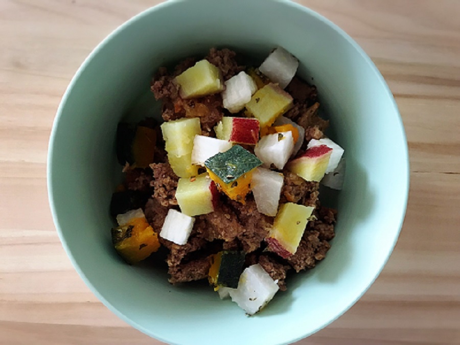 ●このメニューは中型犬・体重15kgの1食分を想定し、プラチナム ウエットフード375gを使用しています。ワンちゃんの大きさによって量などは適宜調節してください。(目安量)