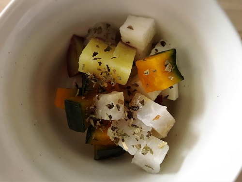 【3】【2】に乾燥バジルとオリーブオイルをカットした野菜に和える