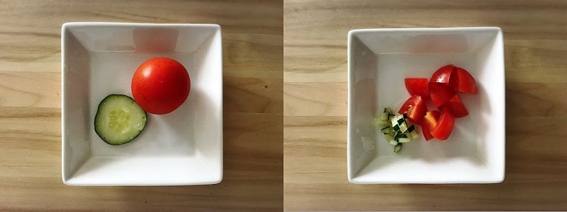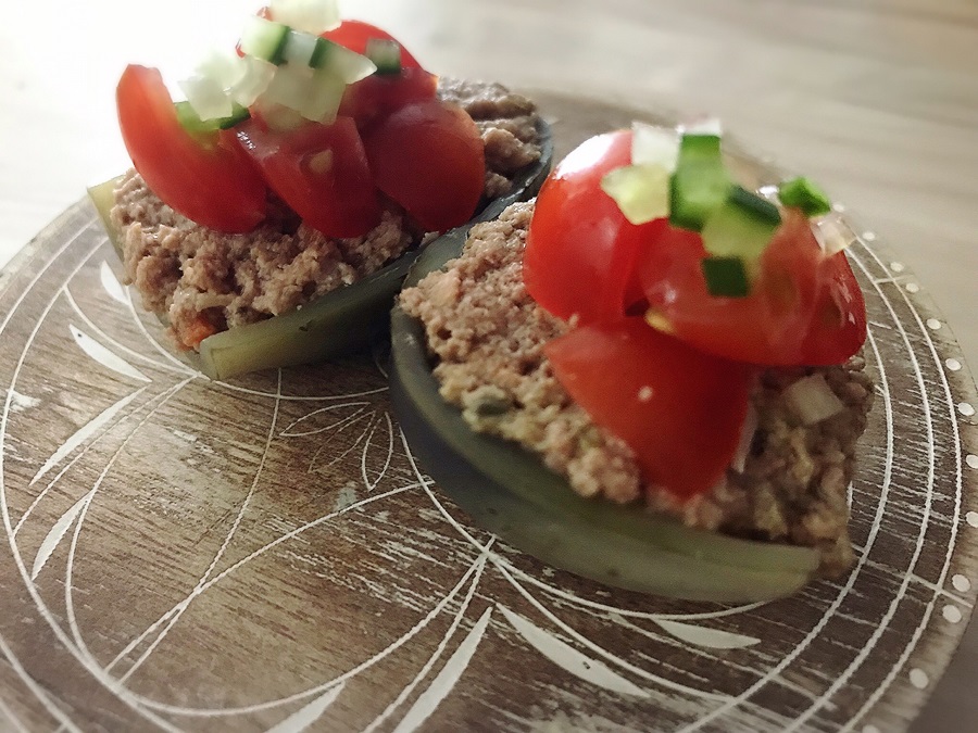 【2】子なすを半分にし中身をくり抜く。水に少し浸した後、好みの方法で柔らかくする。