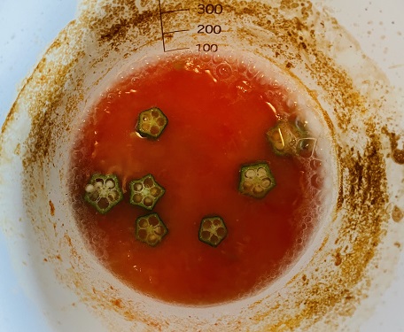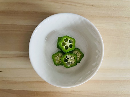 【3】【2】で用意したトマトを煮干し出汁に浸し火にかけ、カットしたオクラを入れる