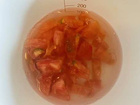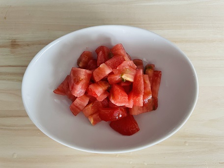 【2】トマトの皮をむいて細かく刻む。オクラも細かくカット。