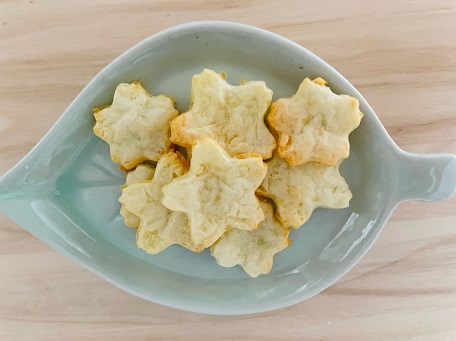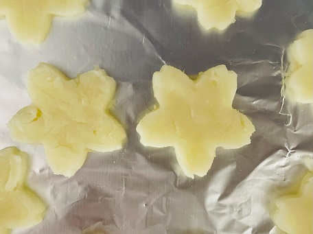 【3】じゃがいもを好みの方法でやわらかくした後潰し、薄くのばして花型に抜く。トースターで焼き目がつく程度に焼く