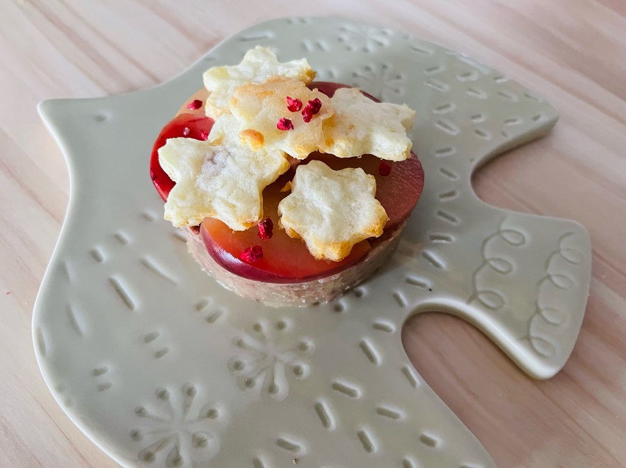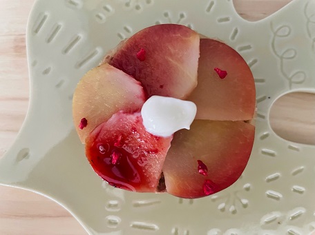 【5】型から抜いた【1】の上に、写真のように【4】を並べていく。【2】で作ったソースを少しかけた後、真ん中にギリシャヨーグルトをのせる。