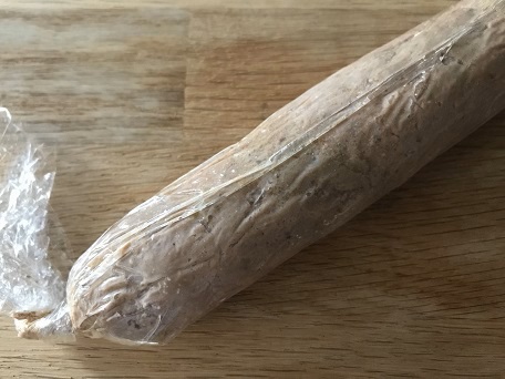 【1】プラチナム ドッグフード (ビーフ+チキン)をラップを使って棒状にし、冷蔵庫で少し冷やす。冷えて少し硬くなったら、包丁で1.5~2センチくらいに切る