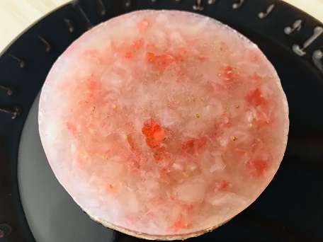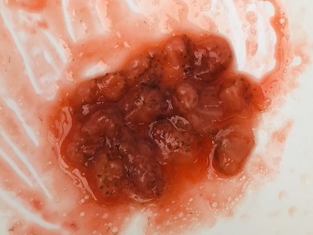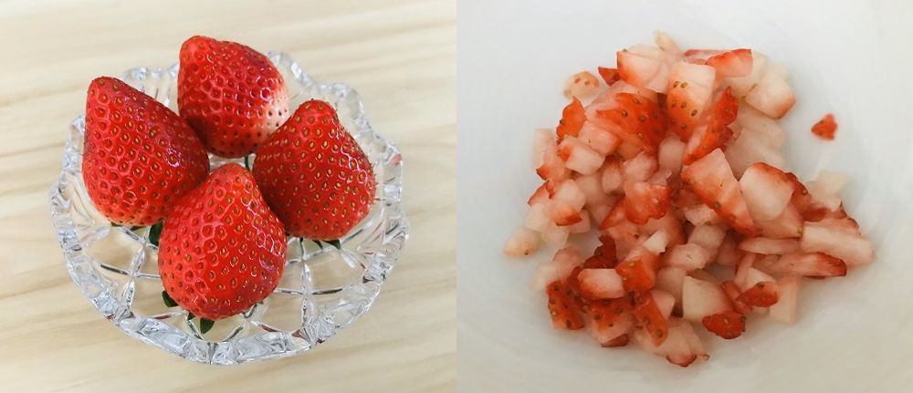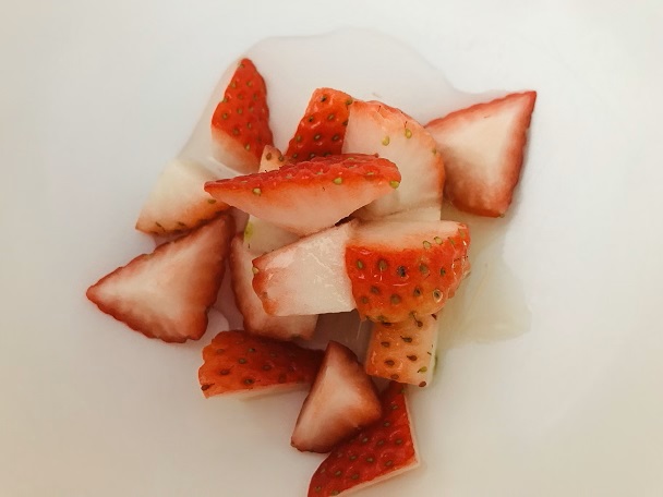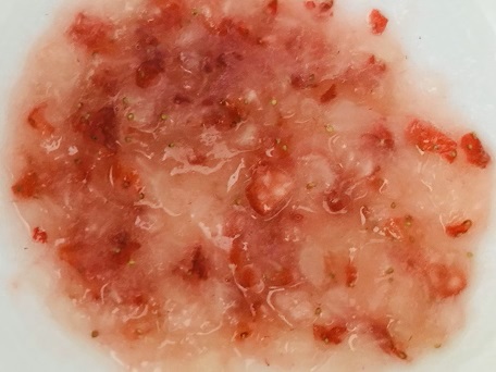 【4】残っている1粒のいちごをカットし、少量のはちみずと水を加え電子レンジでラップをせずに1分(600W)。一度軽くまぜてさらに30秒。(量によって変わりますので、様子をみながらお作り下さい)