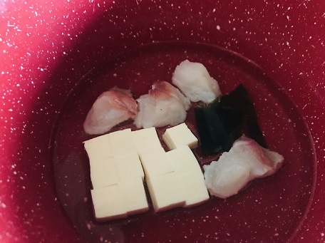 【2】昆布を入れた鍋にお刺身用の鯛と豆腐を入れて煮る