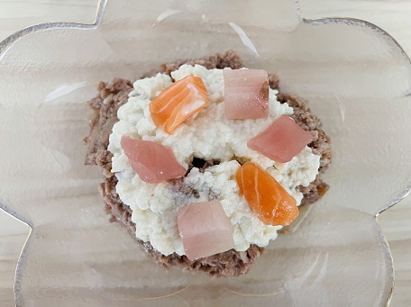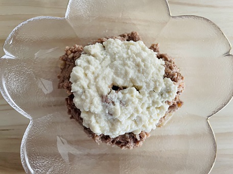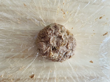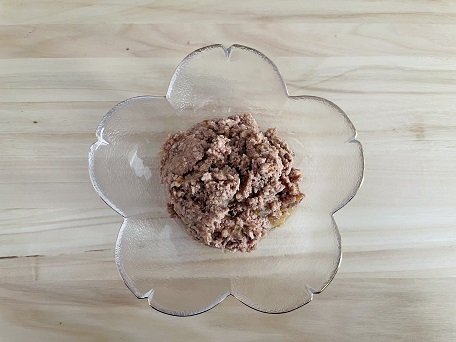 【4】プラチナム ウエットフード(フィッシュ+チキン)をラップを使って丸くし、皿にのせる