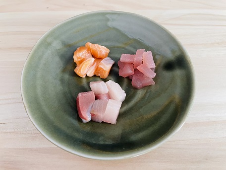 【1】刺身3点(サーモン、ブリ、まぐろ)を食べやすい大きさにカットする