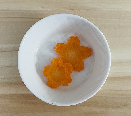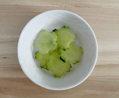 【2】にんじんときゅうりを桜型にする。にんじんだけ好みの方法で柔らかくする。