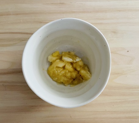【2】バナナをカットし潰し、ヨーグルトに混ぜるウコンパウダーを少量入れる